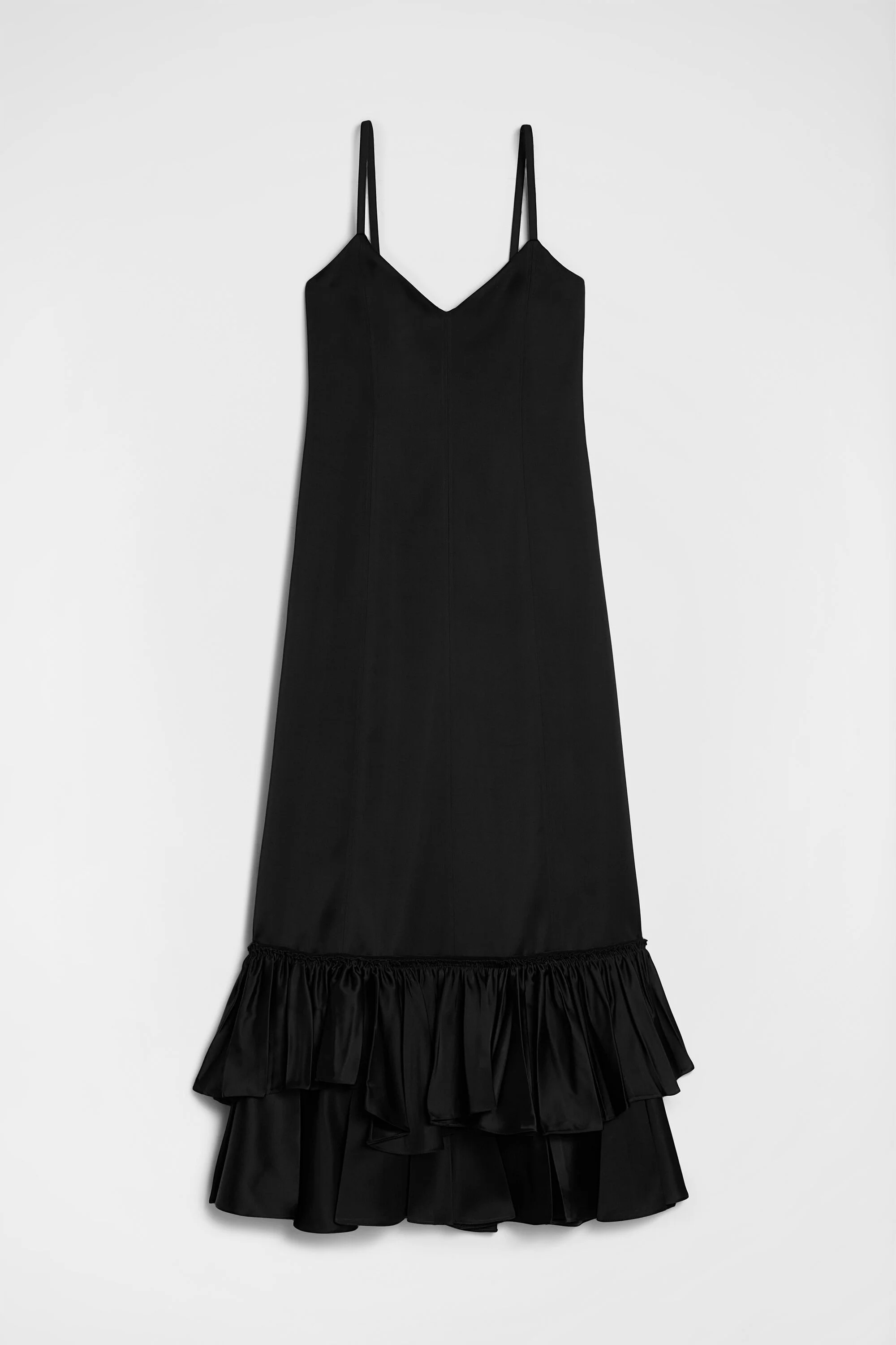 Sleeveless double silk blend dress with bottom ruffles Details - relaxed fit and long length - wide v-neck with thin straps - side zip closure - viscose lining - double silk and viscose blend - 83% viscose-rayon 17% silk - made in Italy - StyleID: J02CT0576J65350001 Care - dry clean only - iron with care Fit - model is 177cm/5'9" and is wearing a size 34 DE - Please note that the physical label of the item will show the German size