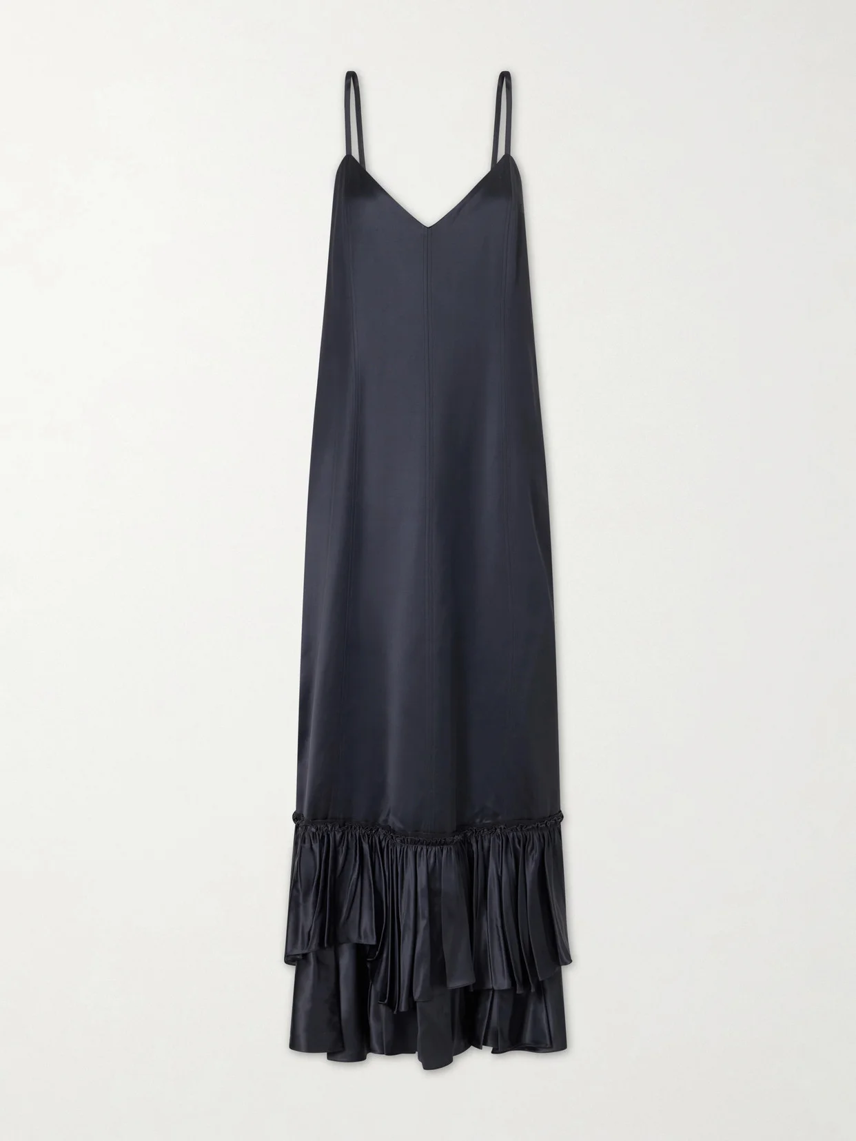 Jil Sander's cutting-edge, refined style stands out in the design of this dress. Made from silk-blend satin, it has a V-neckline set by slender straps and falls to a maxi length framed by a tiered ruffled hem. Style yours with a cardigan buttoned only at the front for an effortless on-the-go look.