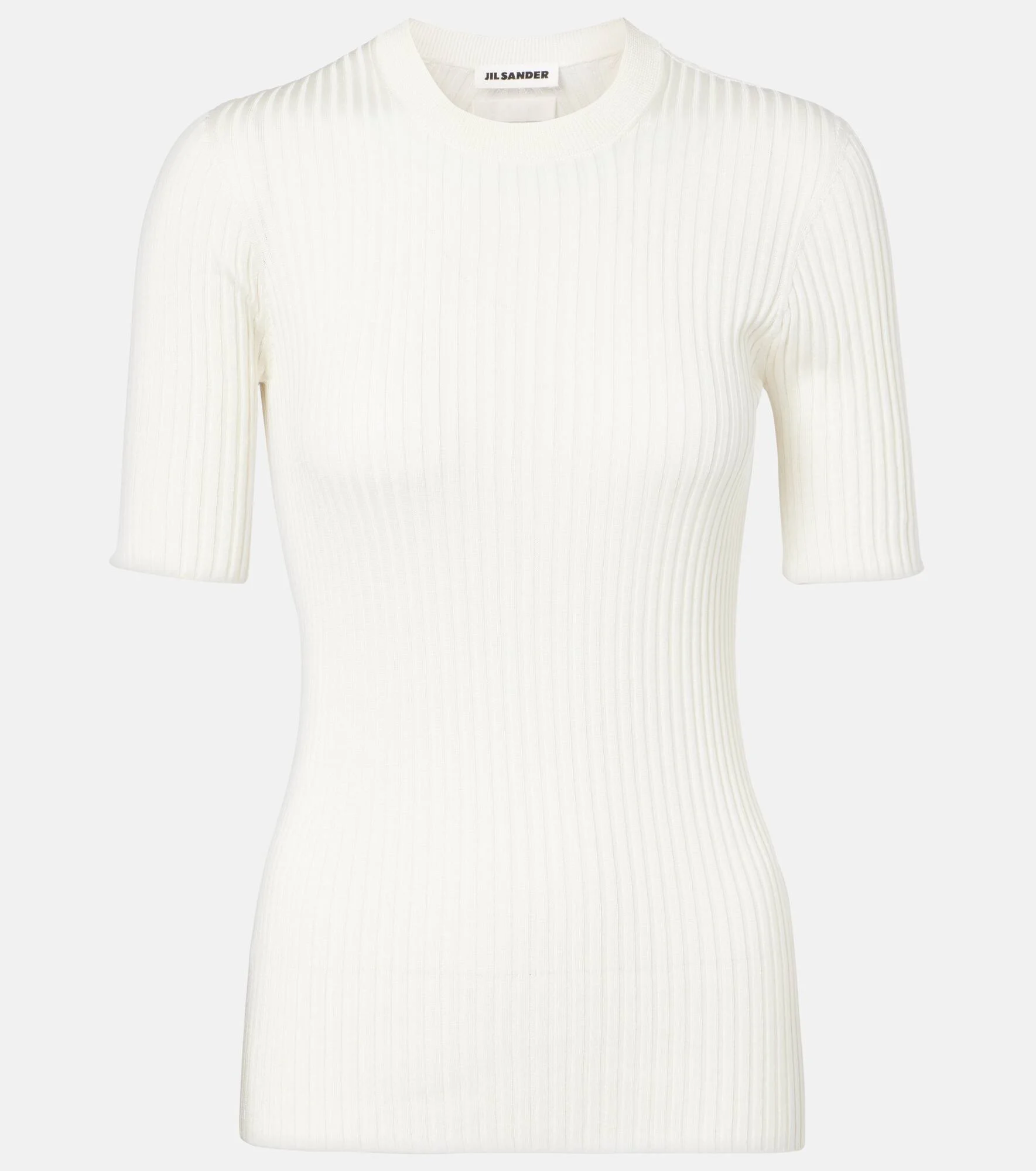 Jil Sander's sophisticated minimalism is characterized by neutral tones, clean lines, and precisely-placed details. This sweater is made from pure silk to a short-sleeved silhouette with a crew neckline. Product Details - Material: 100% silk - Care instructions: dry clean - Made in Italy - Designer color name: Eggshell - Item color: white - Item number: P01045480 Size & Fit - True to size - Fitted - Stretchy fabric - Falls to the hip - The model seen in the picture is 178cm-5'10" and wearing a size DE 34