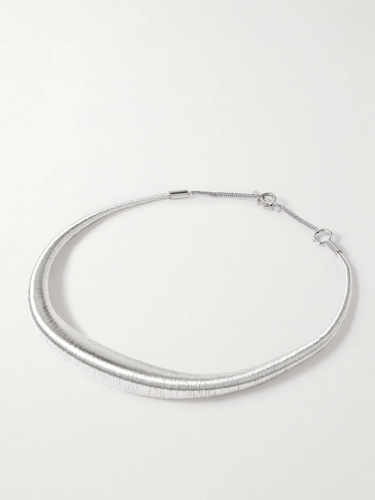 Jil Sander's necklace is crafted from silver-tone wire, meticulously wrapped to form a sculptural silhouette that gradually widens toward the center. The adjustable T-bar fastening allows you to switch up the length depending on your neckline. Our edit includes a gold-tone version, too.