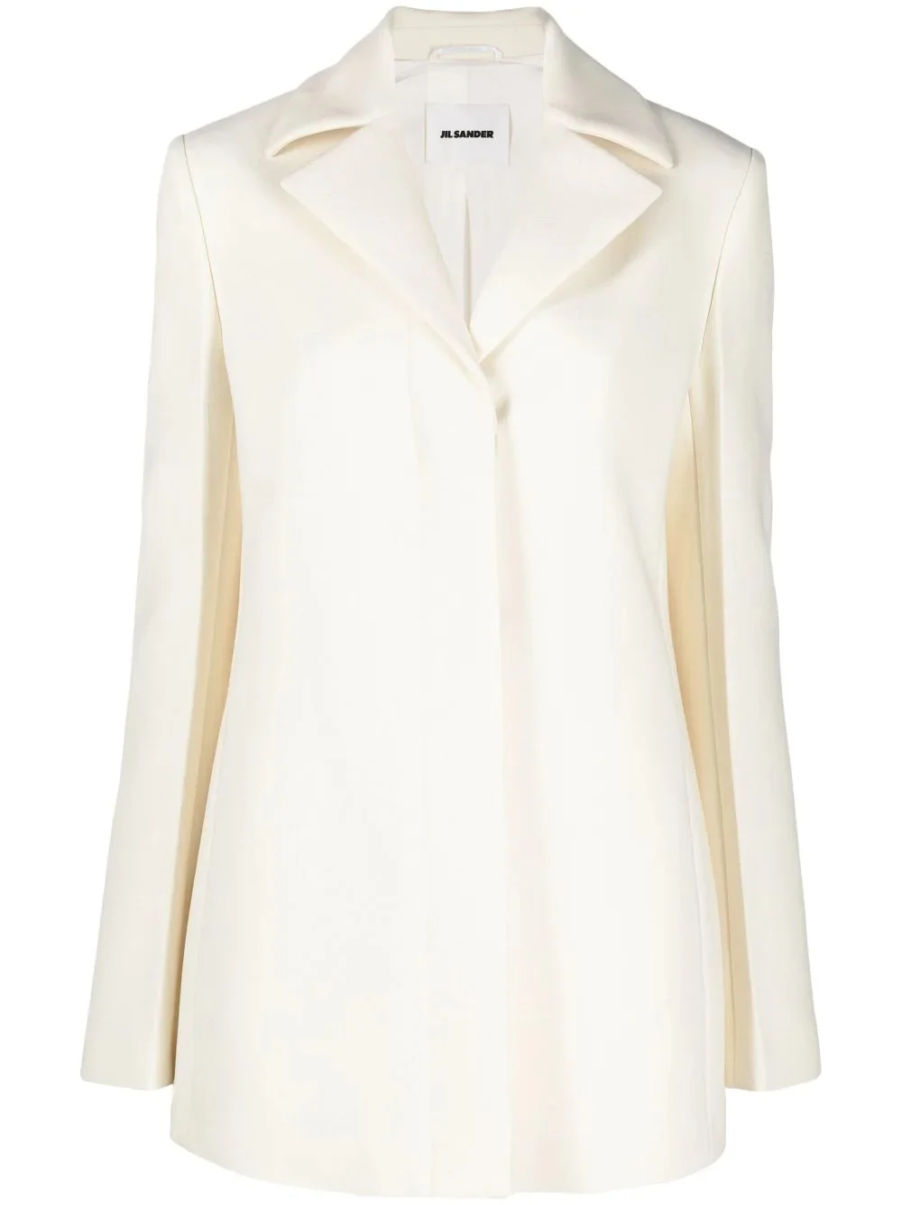 single-breasted blazer ivory virgin wool concealed front fastening long sleeves camp collar long sleeves Made in Italy Composition Outer: Virgin Wool 100% Lining: Viscose 100% SIZE & FIT Model measurements Height 5 ft 11 in(1.8 m) Bust/Chest 31.49 in(80 cm) Hips 35.82 in(91 cm) Waist 24.8 in(63 cm) FittingInformation This piece fits true to size. We recommend you get your regular size Cut for a loose fit Made with a mid-weight non-stretch fabric Washing instructions Dry Clean Only
