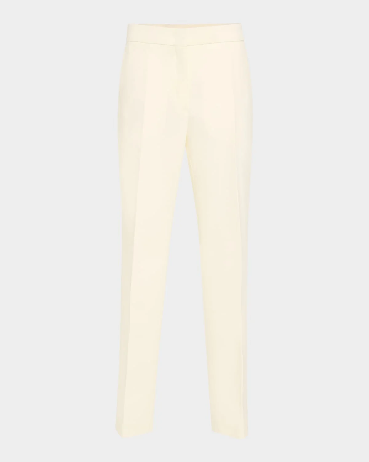 Jil Sander crepe trousers featuring back slit hem details Mid rise sits high on hip Side split pockets; back welt pockets Straight legs Full length Hook/zip fly Wool Dry clean Made in Italy
