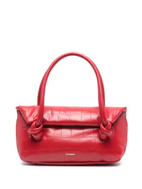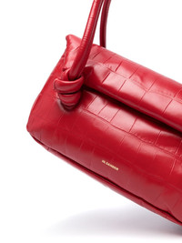 small crocodile-effect shoulder bag Jil Sander’s Lucie and Luke Meier say this bag is a study of shape. It’s crafted from red mock-crock leather with a rounded base and angular front flap and suspends from knotted top straps for a crafty touch. Highlights - Red - Calf leather - Embossed crocodile effect - Two rolled top handles - Knot detailing - Logo stamp to the front - Main compartment - Internal zip-fastening pocket - Contrast lining - Foldover top with magnetic fastening - This piece comes complete with a protective dust bag. Made in Italy Composition Outer: Calf Leather 100% Lining: Calf Leather 100% SIZE & FIT Measurement DEPTH 3.93 in(10 cm) HANDLE 8.07 in(20.5 cm) HEIGHT 5.51 in(14 cm)