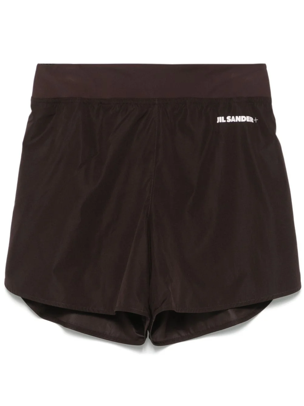 logo-print track shorts Highlights - Coffee brown - Elasticated waistband - Pleat detailing - Layered details - Thigh-length Made in Italy Composition Lining: Polyester 100% Outer: Polyester 100%