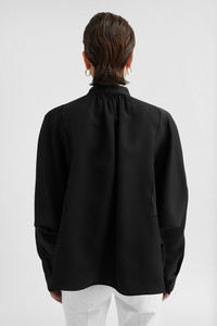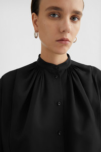 Long-sleeved viscose and silk shirt with smocked neckline and embroidered Jil Sander monogram Details - relaxed fit and boxy shape - smocked neckline - small stand collar - embroidered seam detail on armholes and body - embroidered Jil Sander monogram - fluid viscose and silk twill - 68% viscose, 32% silk - made in Italy - StyleID: J05DL0014J65014001 Care - dry clean only - iron with care Fit - model is 177cm/5'9" and is wearing a size 34 DE - Please note that the physical label of the item will show the German size