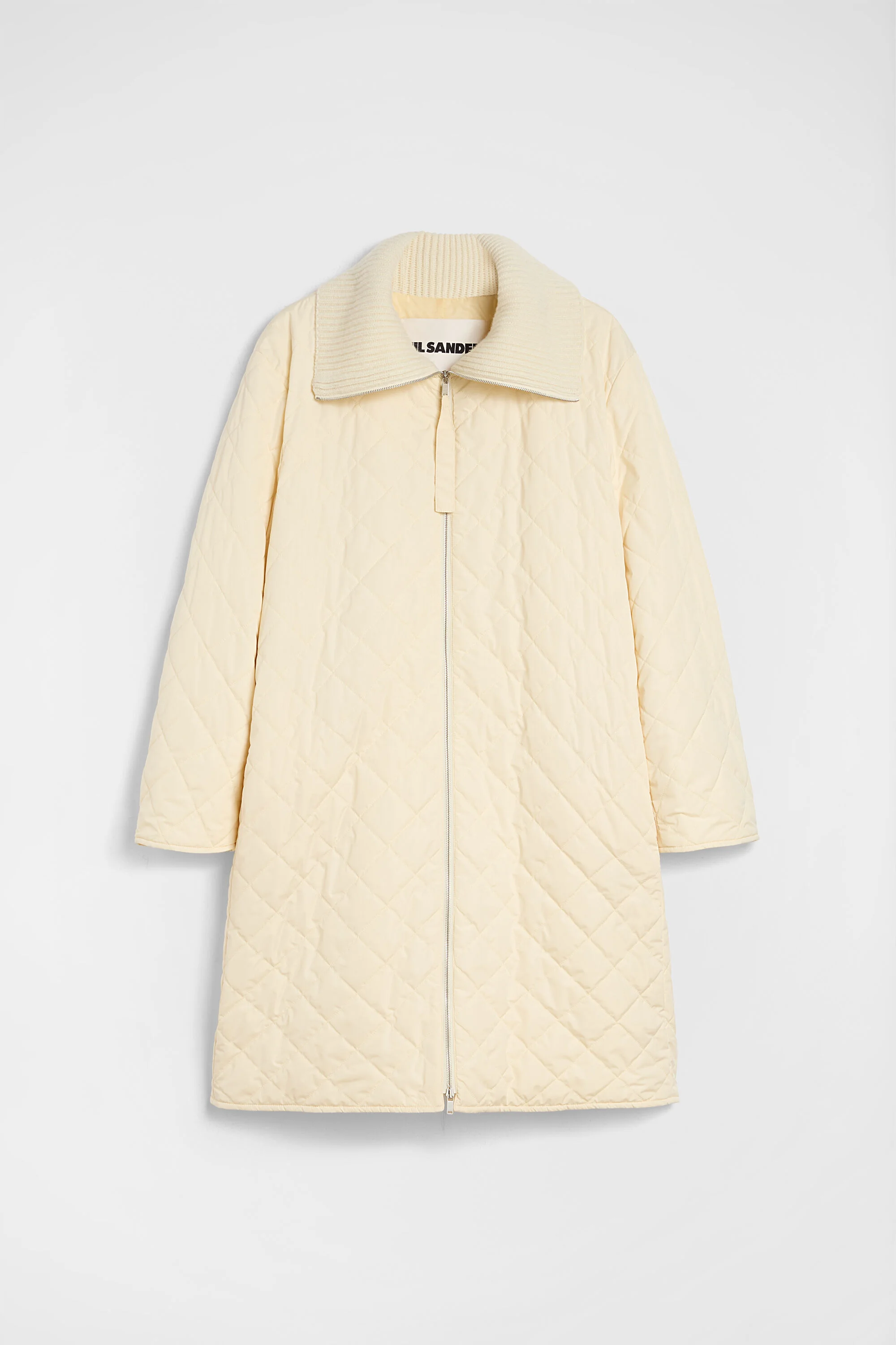 Water repellent lightweight recycled polyester taffeta down coat with ribbed collar Details - oversized fit and knee length - dropped shoulders - front zip closure - side-seam pockets - polyester padding and lining - diamond quilting - water repellent lightweight recycled polyester taffeta - 100% polyamide-nylon - made in Italy - StyleID: J01SW0010J70216106 Care - dry clean only - iron with care Fit - model is 177cm/5'9" and is wearing a size 36 DE - Please note that the physical label of the item will show the German size