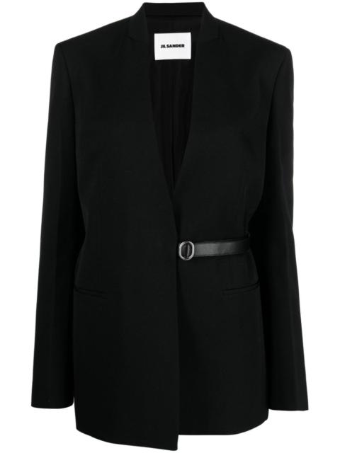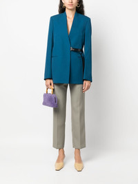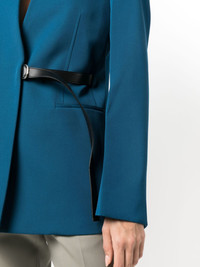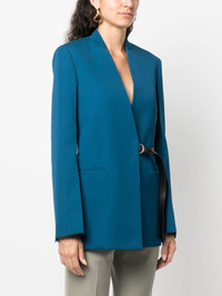 tailored virgin wool blazer Highlights - Teal blue - Virgin wool - Tailored design - Dart detailing - Plunging v-neck - No lapels - Long sleeves - Belted waist - Two front welt pockets - Italian rear vents Made in Italy Composition Leather 100% SIZE & FIT Model measurements Height 5 ft 10 in(1.79 m) Bust/Chest 33.07 in(84 cm) Hips 35.82 in(91 cm) Waist 24.01 in(61 cm) FittingInformation Designed to be unstructured, offering a loose fit throughout The belt offers adjustability for fitted preferences Made from a midweight non-stretch fabric This piece fits true to size – take your usual size