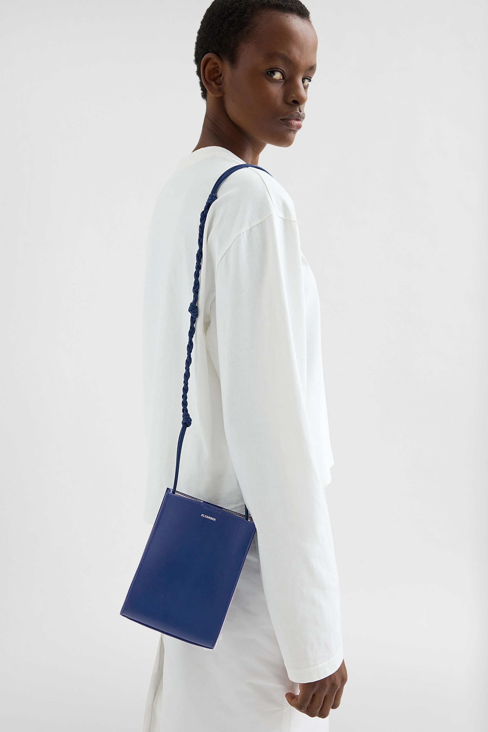 Small-sized leather shoulder and crossbody bag with hand-knotted strap and embossed Jil Sander logo Details - hand-knotted strap - rectangular shape - magnetic button closure - nappa lining - foil embossed Jil Sander logo - 100% calf leather - w 14 cm x h 19 cm x d 5 cm - made in Italy - StyleID: J07WG0001P9044412