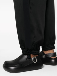 high-waisted tapered-leg trousers Championing minimalism, Jil Sander proposes clothing and accessories that are understated yet unique. A case in point, these black trousers are cut to a relaxed, sporty track silhouette with an elasticated drawstring waistband and cuffs elevated by its unconventional satin construction, lending lustre. Highlights - Black - Mid-rise - High waist - Tapered leg - Elasticated drawstring waistband - Two side inset pockets - Two rear patch pockets - Drawstring cuffs - Two rear patch pockets - Elasticated ankles Made in Italy Composition Acetate 74%, Viscose 26% SIZE & FIT Model measurements Height 5 ft 11 in(1.8 m) Bust/Chest 31.49 in(80 cm) Hips 36.61 in(93 cm) Waist 24.4 in(62 cm) FittingInformation Designed for a relaxed tapered cut, these trousers allow for a close fit at the waist and offer a loose fit at the thighs, with a closer fit toward the ankles The elasticated hem at the ankle allows for movement and a comfortable fit Made from a midweight non-stretch fabric This piece fits true to size – take your usual size Washing instructions Dry Clean Only