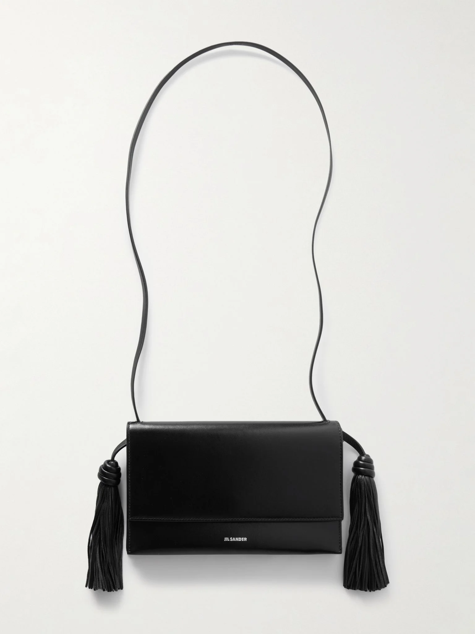 Jil Sander's bag is minimally detailed with knotted tassels that sway as you move. Crafted in Italy from leather, it has a sleek fold-over shape and enough space inside for your phone and most-used cards. Adjust the shoulder strap to your preferred drop. Details & Care - Black leather - Adjustable shoulder strap - Internal slip pocket - Leather lining - Magnetic-fastening front flap