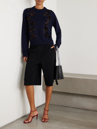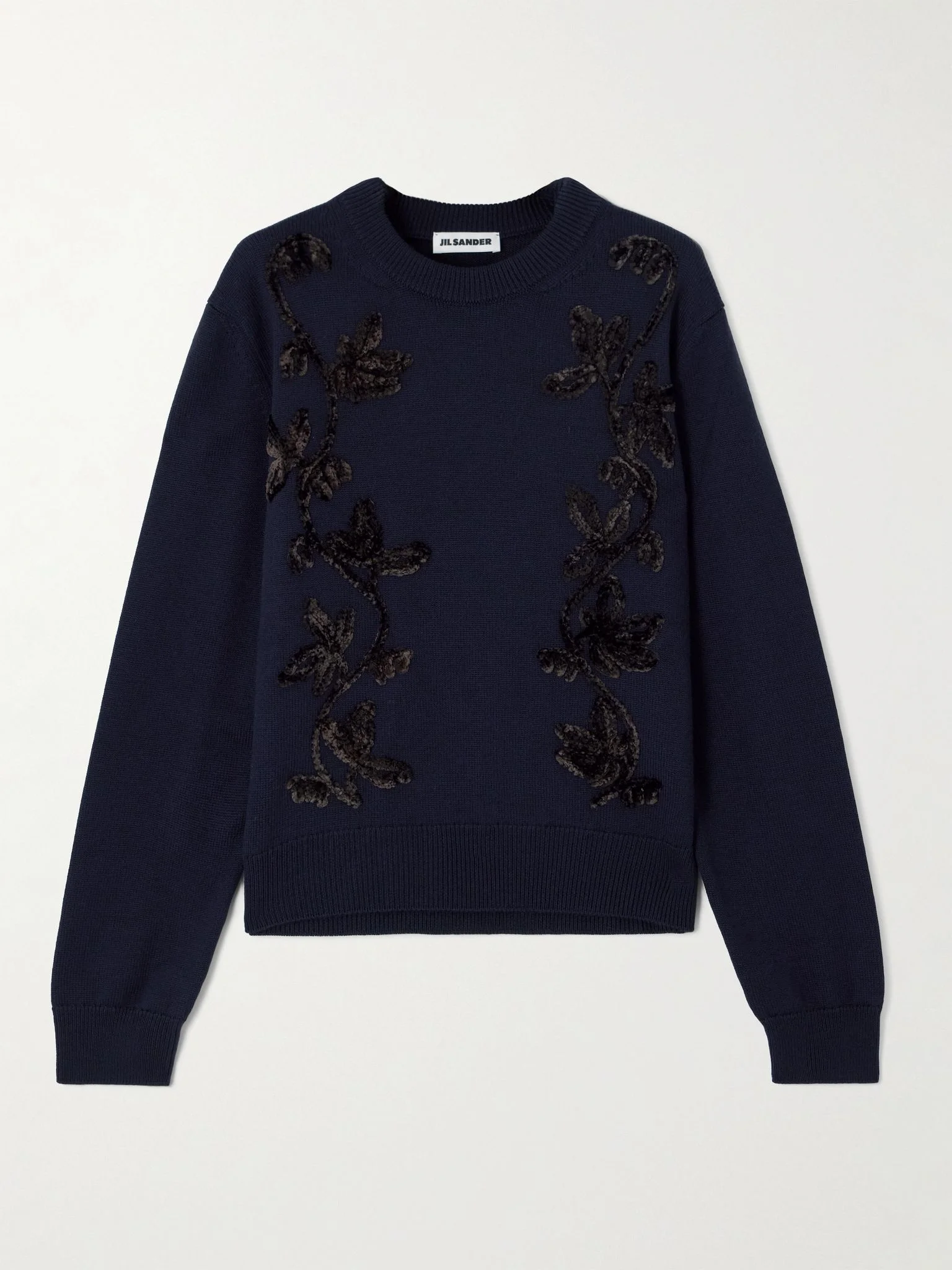Jil Sander's sweater is knitted from merino wool and embroidered with velvet flowers. The slightly loose fit and dropped shoulders give it a more relaxed vibe. Size & Fit - Fits true to size, take your normal size - Intended for a slightly loose fit - Mid-weight, embroidered knit - Model is 180cm/ 5'11" and is wearing a FR 36 Model measurements: - Bust: 86cm/ 34" - Waist: 65cm/ 25.5" - Hip: 90cm/ 35.5" Details & Care - Navy merino wool - Slips on - 100% merino wool - Dry clean