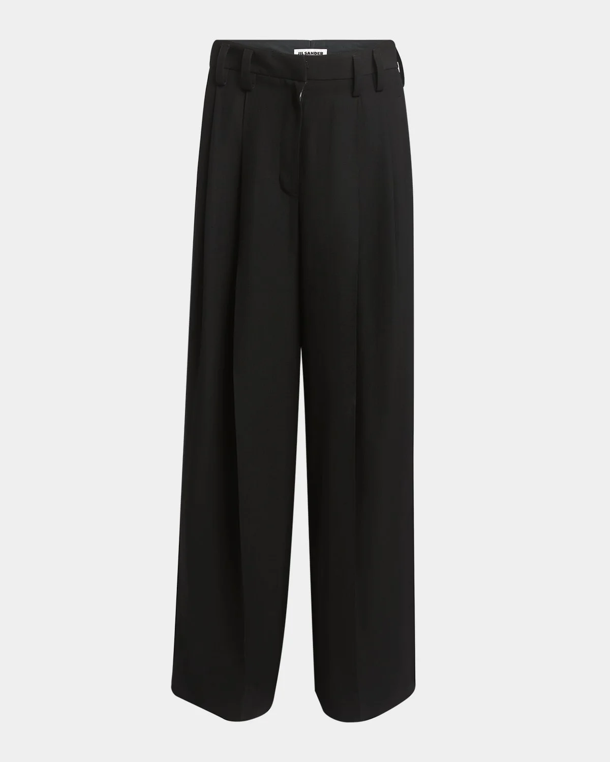 - Jil Sander pants featuring a voluminous double pleated front and a drop crotch - Approx. measurements: - 18.0" rise; 34" inseam; 46" outseam - High rise - Side slip pockets; back welt pocket - Wide legs - Full length - Hook/zip fly; belt loops - Viscose/silk - Lining: Viscose - Dry clean - Made in Italy
