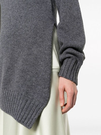 waffle-knit asymmetric jumper Highlights - Grey - Virgin wool blend - Waffle knit - High neck - Extra-long sleeves - Side slit - Ribbed cuffs and hem - Asymmetric hem Made in Italy Composition Yak 50%, Virgin Wool 50% SIZE & FIT Model measurements Height 5 ft 10 in(1.78 m) Bust/Chest 31.49 in(80 cm) Hips 36.22 in(92 cm) Waist 25.59 in(65 cm) FittingInformation Designed for a slim fit that sits just away from the body offering a close yet comfortable fit Made with a midweight knit, this piece offers some stretch This piece fits true to size – take your usual size Washing instructions Dry Clean Only