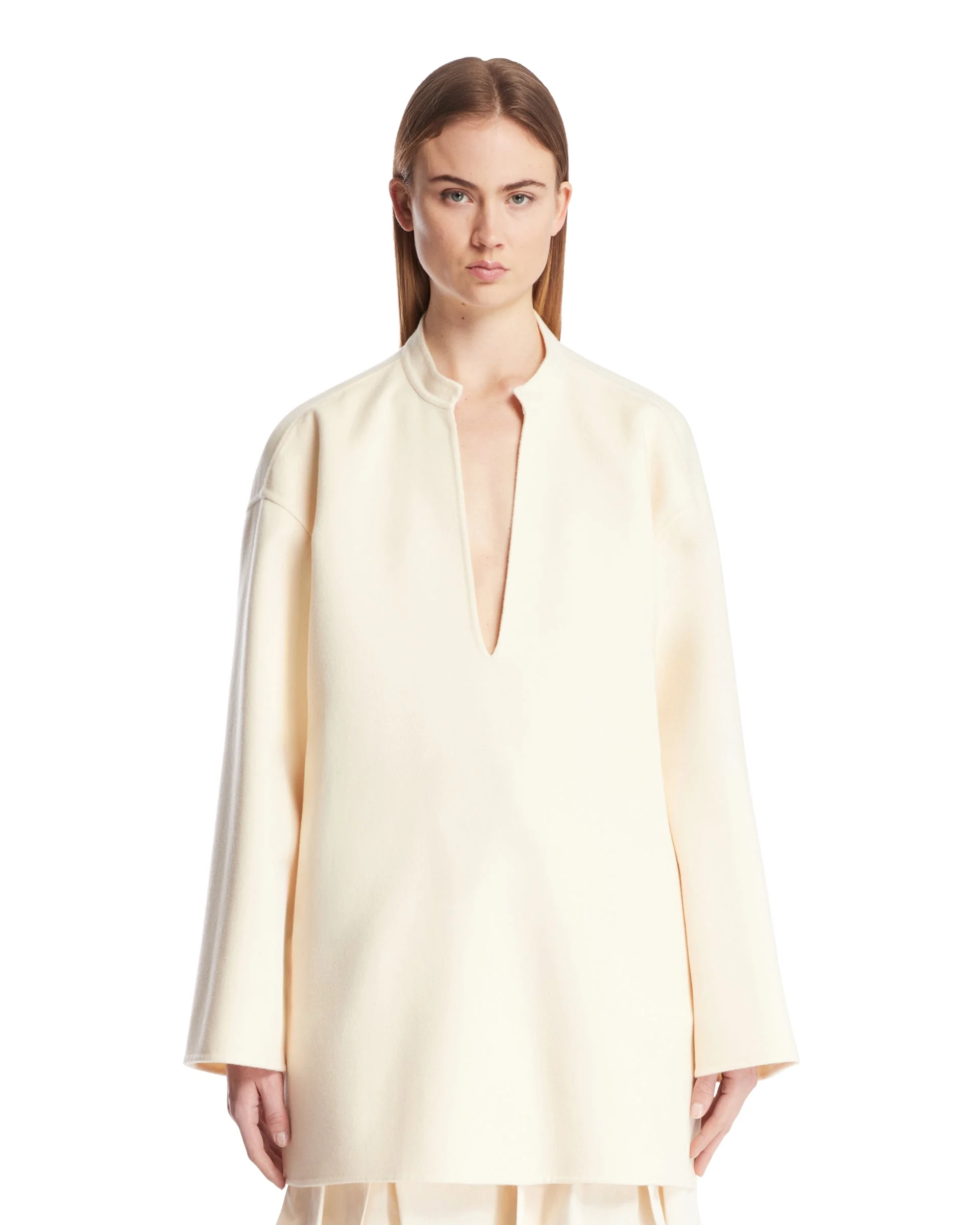 Jil Sander White Cashmere Top. White cashmere, long sleeves, crew neck with a deep front slit. Drop-shoulder design, straight hem, relaxed fit. Willeke is 177 cm and she is wearing size 34. DETAILS Model: J04NC0104J35001109 Composition: 100% Cashmere Made in: ITALY Season: SS25