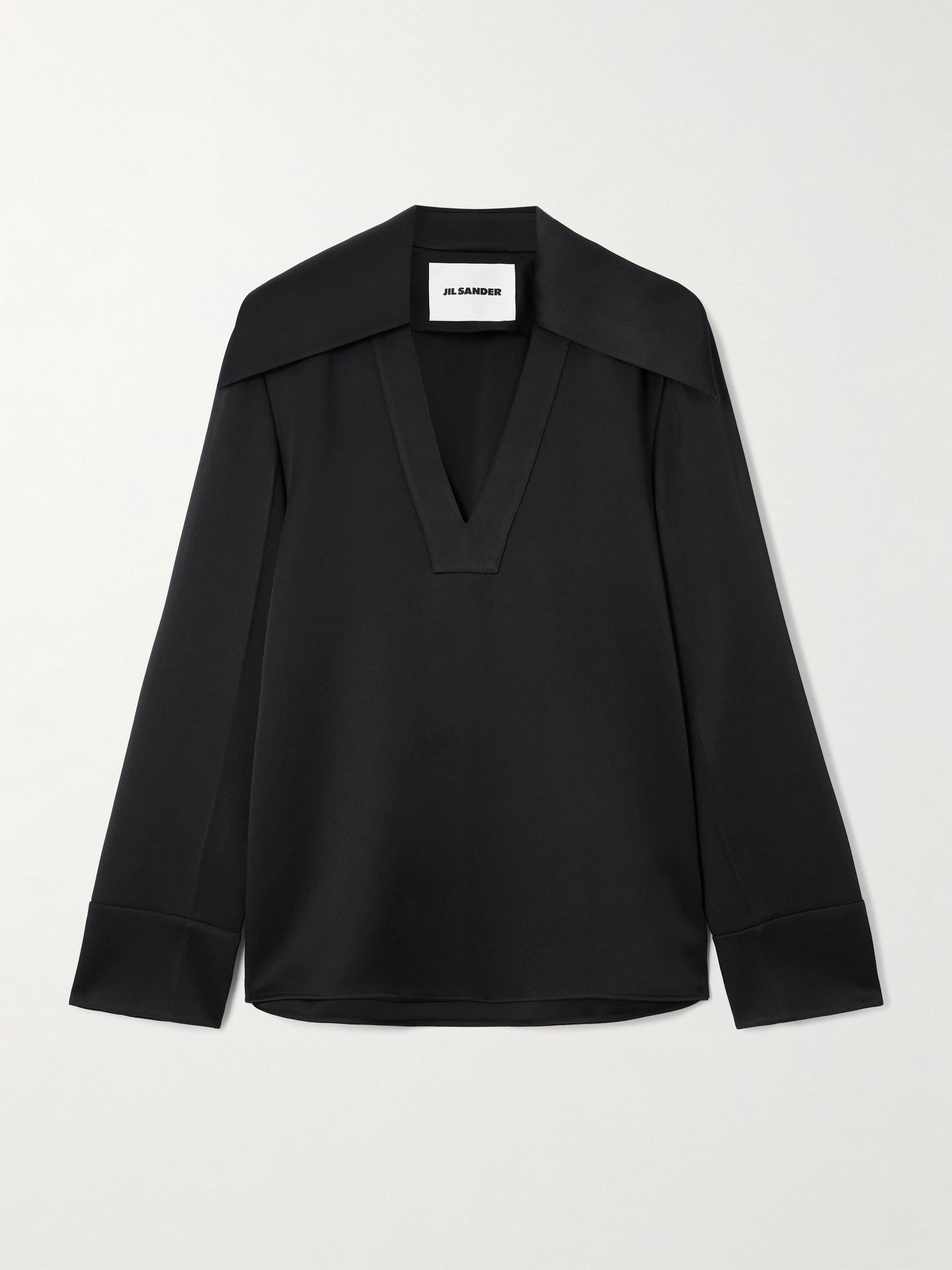 You'll reach for Jil Sander's blouse so often. It's made from satin-crepe for a relaxed fit with a chic wide collar and V-neckline. Size & Fit - Fits true to size, take your normal size - Designed for a relaxed fit - Lightweight, fluid, non-stretchy fabric - Model is 177cm/ 5'10" and is wearing a DK 34 Model measurements: - Bust: 80cm/ 31.5" - Waist: 60cm/ 23.5" - Hip: 89cm/ 35" Details & Care - Black satin-crepe - Slips on - 73% acetate, 27% viscose - Dry clean