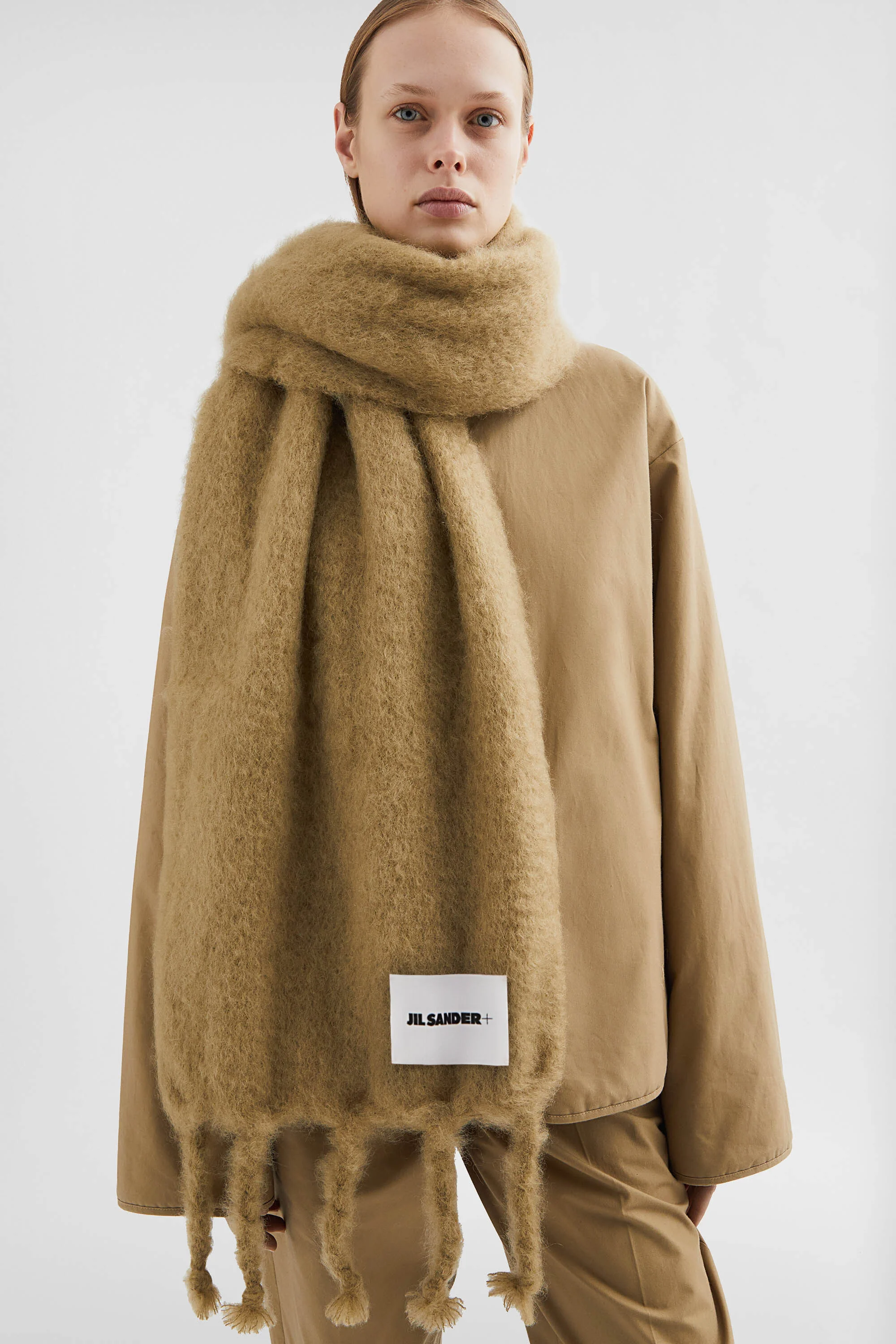 Long handknit wool and mohair scarf with Jil Sander+ logo label Details - fringed hem detail - Jil Sander+ logo label stitched at bottom - 73% mohair 24% wool 3% polyamide - made in Spain - StyleID: J47TE0113J40041264 Care - dry clean only - iron with care