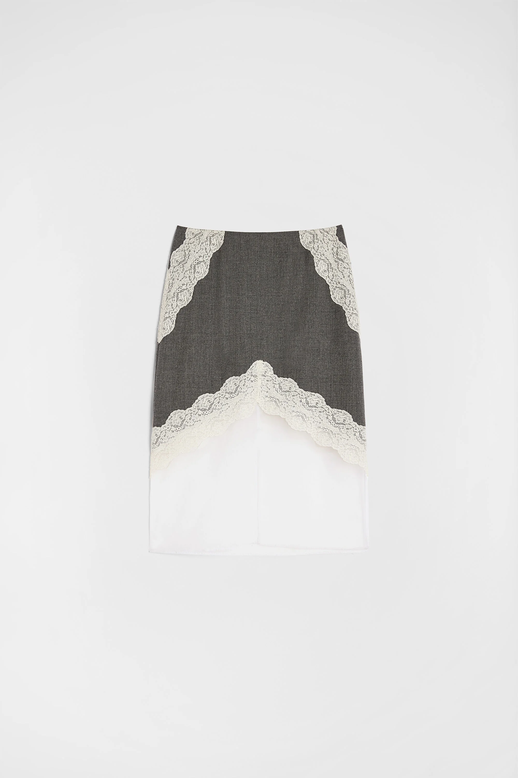 Knee-length wool canvas skirt with organza bottom and lace embroidery Details - straight cut - slightly high waist - centre-back zip closure and slit - viscose lining - skirt top fabric 100% wool, organza bottom fabric 100% polyester - made in Italy - StyleID: J03MA0257J41557030 Care - dry clean only - iron with care Fit - model is 177cm/5'9" and is wearing a size 34 DE - Please note that the physical label of the item will show the German size
