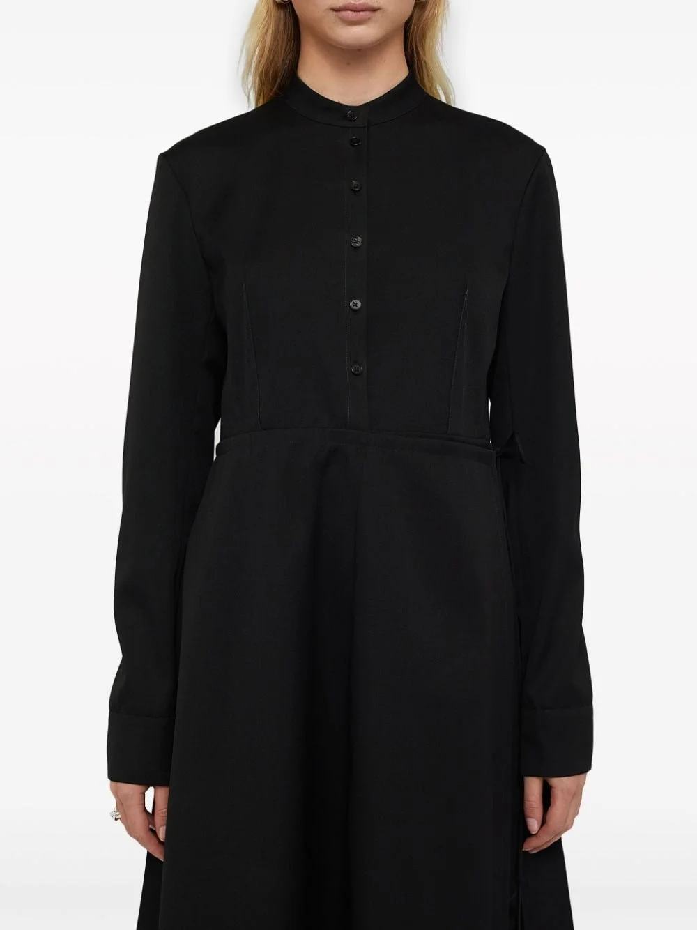 wrapover-panel virgin wool shirtdress Highlights - Black - Virgin wool - Wraparound style - Band collar - Front button placket - Long sleeves - Two side inset pockets - Straight hem - Mid-length Made in Italy Composition Virgin Wool 100% SIZE & FIT FittingInformation Designed for a wraparound style that can be adjusted to your preference Made from a lightweight non-stretch fabric This piece fits true to size – take your usual size