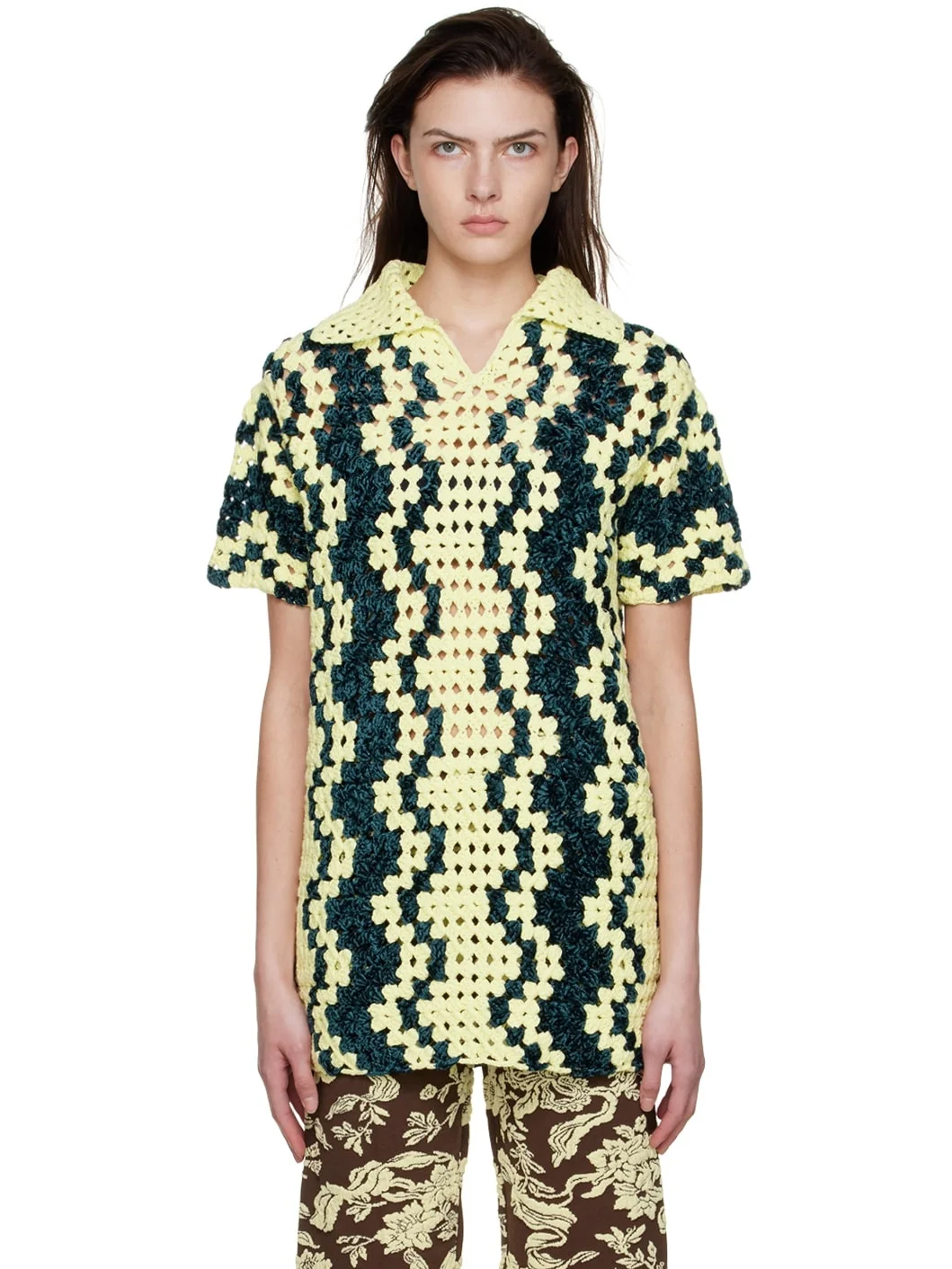 Hand-crocheted cotton and viscose-blend polo. · Spread collar · Hook-eye fastening Supplier color: Open yellow 35% cotton, 24% viscose, 22% polyamide, 9% wool. Made in Italy 221249F108002