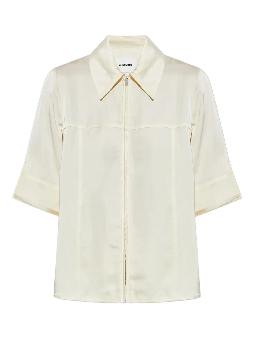 zip-front collared shirt Highlights - Cream - Zip fastening - Classic collar - Short sleeves - Seam detailing - Straight hemline Made in Italy Composition Viscose 100% Washing instructions Read Manufacturer Guidelines