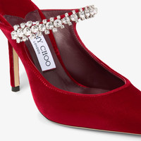 Details, Care & Fit Crafted in ruby red velvet, the signature Bing mule is defined by a distinctive crystal-embellished strap; ensuring secure support and a touch of glamour. Finished with a leather lining and sole, pointed toe and sleek 100mm stiletto heel. - Velvet - Crystal strap - Pointed toe - Slip-on style - Leather lined - Leather sole - Heel height measures: 100mm/3.9 inches - Made in Italy