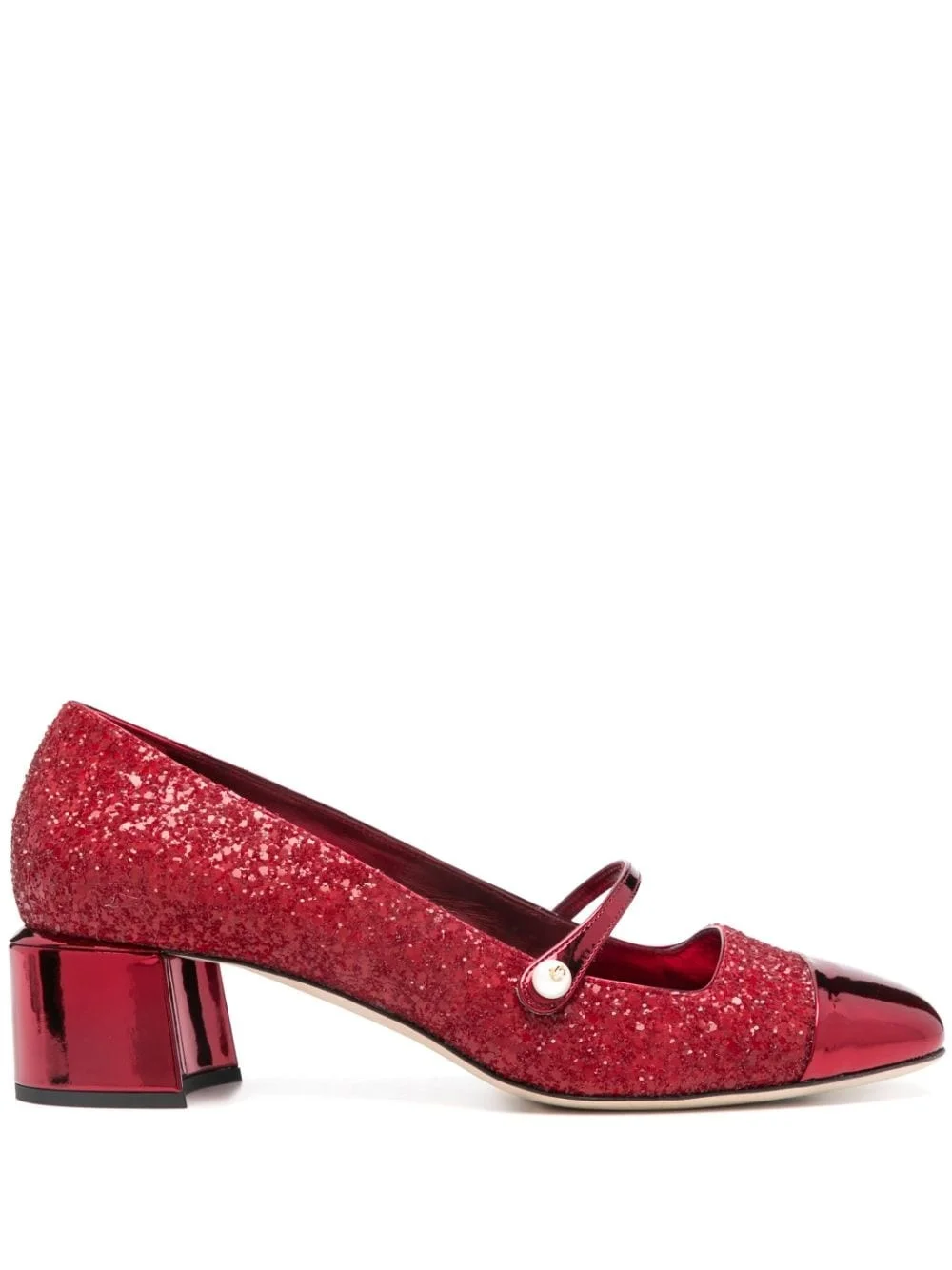 45mm Elisa pumps Highlights - Ruby red - Calf leather - Slip-on style - Glitter detailing - Crossover strap detail - Pearl detail - Contrasting toecap - Square toe - Branded leather footbed - 45mm low block heel - Leather and rubber outsole Made in Italy Composition Outer: Calf Leather 100%, Rubber 100% Lining: Calf Leather 100% Sole: Calf Leather 100% SIZE & FIT Measurement HEEL 1.77 in(4.5 cm)