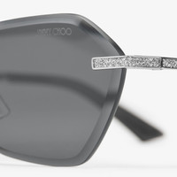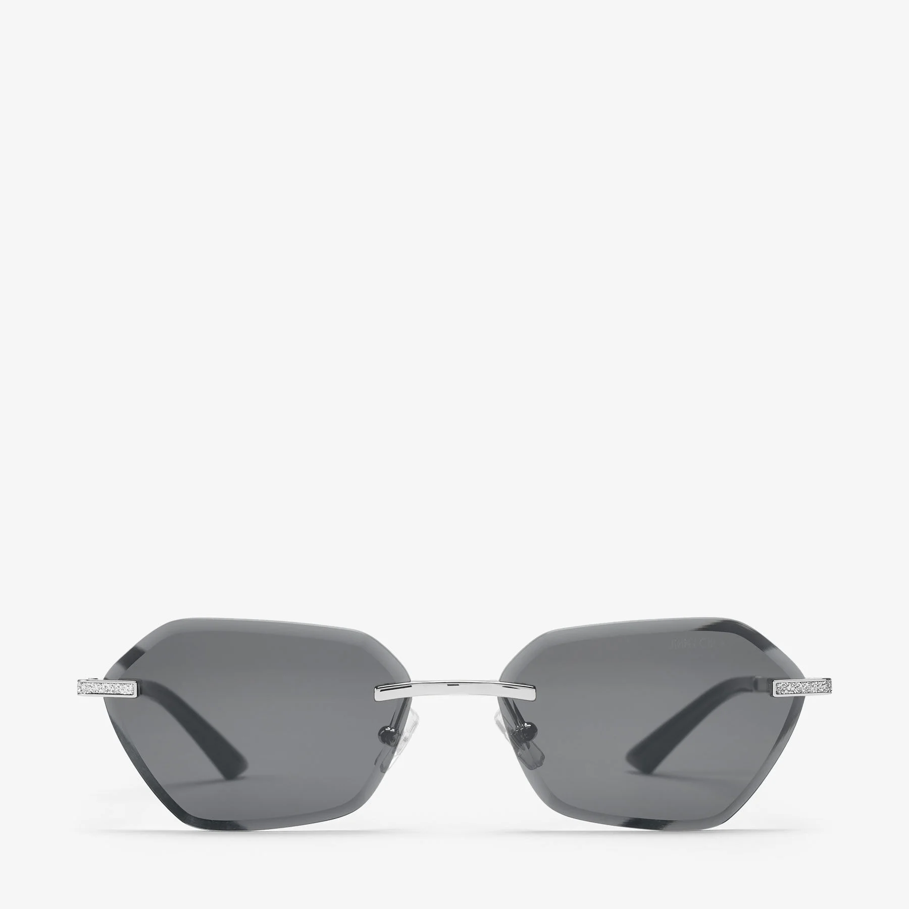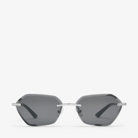 Details, Care & Fit Faceted grey lenses meet slim silver-toned arms, sutbly dusted with tonal glitter. A rimless silhouette keeps the Abby sunglasses lightweight, modern and refined. - Metal - Bio-nylon lenses - Grey shaded lenses - Geometric frame - Jimmy Choo logo - Silver glitter - 100% UVA and UVB protection - Presented with a Jimmy Choo case and cleaning pouch - Lens width: 5.9cm - Bridge length: 1.6cm - Temple length: 14cm - Made in Italy