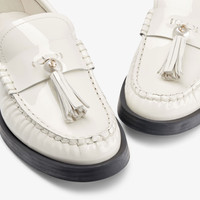 Details, Care & Fit Item No. ADDIEPEARLPAT Exquisitely crafted in patent leather, the Addie flat is a sophisticated loafer that epitomises elegance. This pair is designed with distinctive leather tassel that features our signature pearl embellishment. It is a contemporary approach to a timeless shoe with an effortlessly wearable silhouette, complemented by a soft, rounded toe and short stacked heel. Pair with smart tailoring or off-duty denim looks for versatile styling. - Patent leather - Soft rounded toe - Leather tassel with pearl embellishment - Gold JC emblem - Leather lining and sole - Stacked heel - Made in Italy