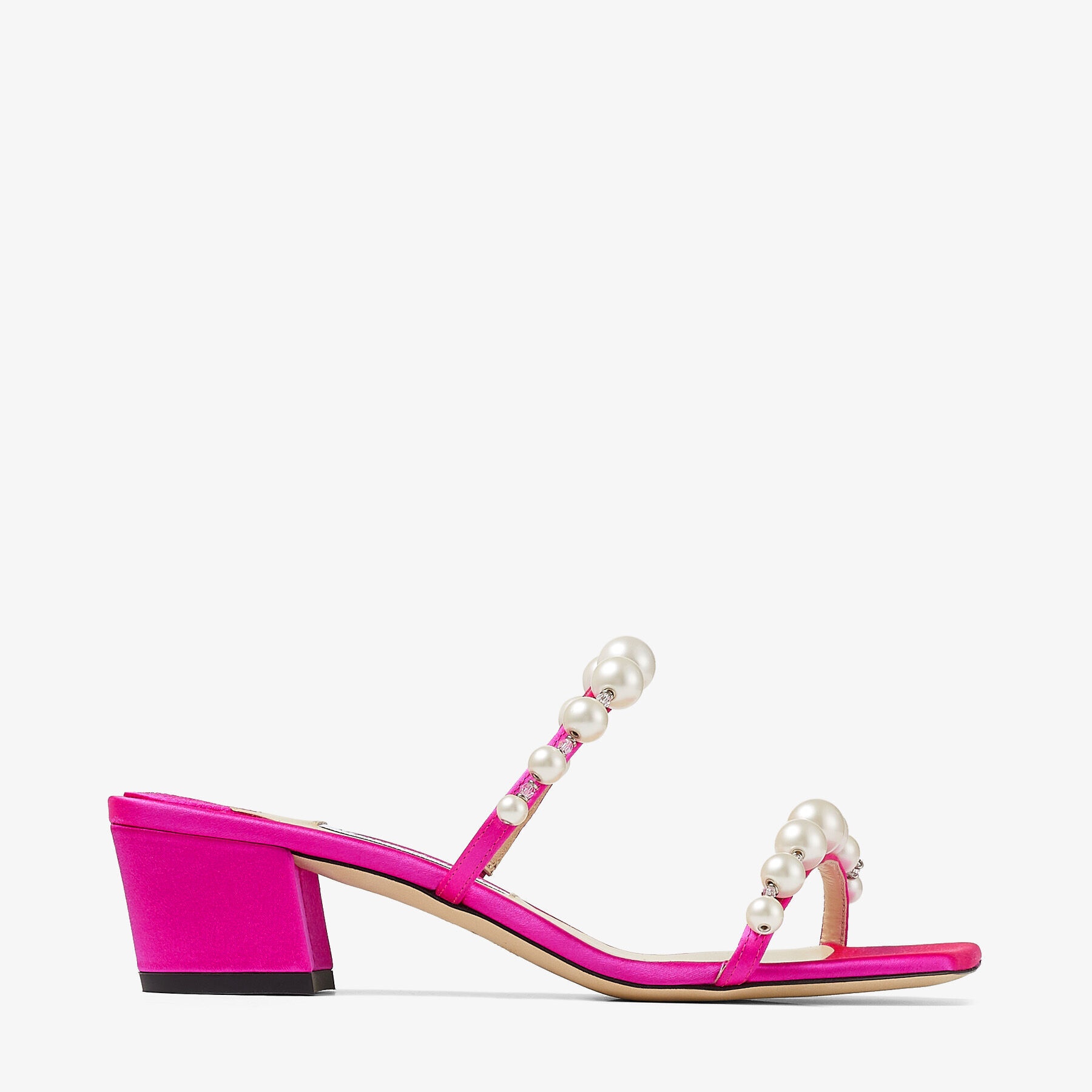 Details, Care & Fit Item No. AMARA45IWP Our AMARA mules are crafted in Italy from bright fuchsia satin. Sophisticated and standout, this style is set on an easy-to-wear 45mm block heel and defined by two rows of delicate pearls and small crystal beads that sit on the toe and arch straps. Let yours carry you effortlessly from dawn to dusk. Italian sizing. Fits true to size. - Satin - Pearl and crystal embellishment - Slanted toe - Block heel - Toe and arch straps - Heel height measures: 45mm/1.8 inches - Made in Italy