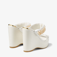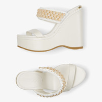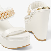 Latte Nappa Leather Wedge Sandals with Beaded Raffia