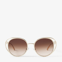 Details, Care & Fit Angela is a refined addition to any wardrobe, designed with metal oval frames. This style is accented by a crystal-encrusted pearl to the left, our signature logo on the right, and a cabochon pearl on each side of the frame. - Pale gold-finish metal - Bio-nylon gradient brown lenses - Oval frame - Pearl and crystal embellishment - 100% UVA and UVB protection - Presented with a Jimmy Choo case and cleaning pouch - Lens width: 5.3cm - Bridge length: 1.8cm - Temple length: 14cm - Made in Italy - Bio-nylon lenses are made with a percentage of bio-based carbon from plant-based sources