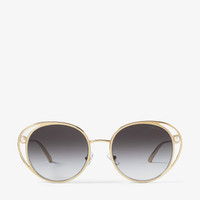 Details, Care & Fit Angela is a refined addition to any wardrobe, designed with metal oval frames. This style is accented by a crystal-encrusted pearl to the left, our signature logo on the right, and a cabochon pearl on each side of the frame. - Pale gold-finish metal - Bio-nylon gradient brown lenses - Oval frame - Pearl and crystal embellishment - 100% UVA and UVB protection - Presented with a Jimmy Choo case and cleaning pouch - Lens width: 5.3cm - Bridge length: 1.8cm - Temple length: 14cm - Made in Italy - Bio-nylon lenses are made with a percentage of bio-based carbon from plant-based sources