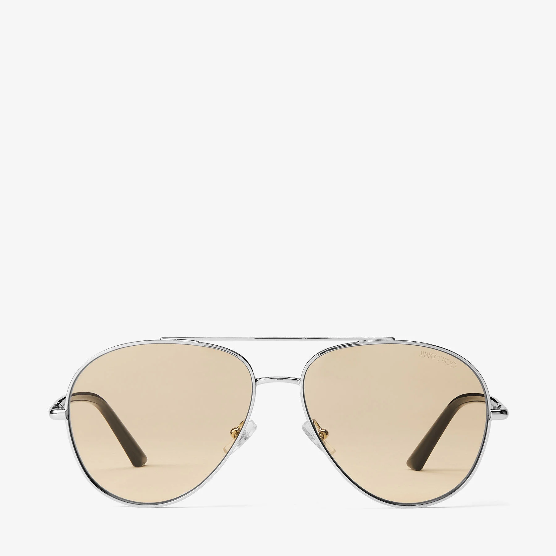 Details, Care & Fit Delicate sunglasses crafted in silver metal with light yellow lenses, defined by a classic aviator silhouette. A Jimmy Choo logo details the left upper lens, while custom JC round metal plates decorate the nose pads. Acetate temple tips are finished with metal diamond studs. - Metal - Aviator - Light yellow lenses - Jimmy Choo logo - Custom JC round metal plates on the nose pads - Acetate temple tips - Metal diamond stud detailing - 100% UVA and UVB protection - Presented with a Jimmy Choo case and cleaning pouch - Lens width: 5.8cm - Bridge length: 1.4cm - Temple length: 14cm - Weight: 28 grams - Made in Italy