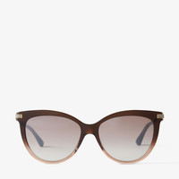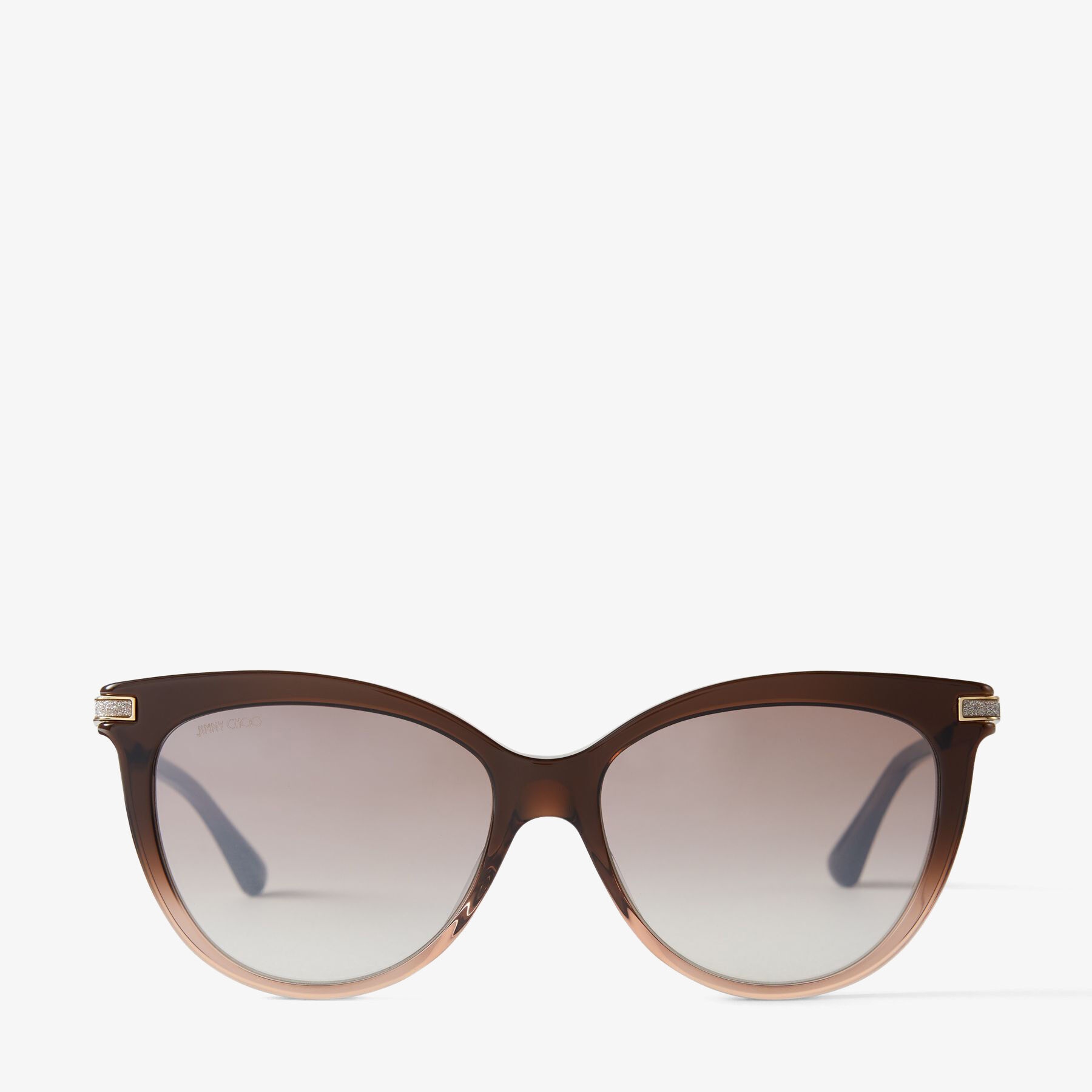 Details, Care & Fit Item No. AXELLEGS56E0MY In a flattering cat eye shape, our brown to beige gradient acetate and metal AXELLE sunglasses are an elegant choice. The slender temples are finished with hand-applied glittering crystals for a note of glamour. - Acetate and metal - Cat-eye frame - Hand-applied crystal temples - 100% UVA and UVB protection - Comes with Jimmy Choo case and cloth - Made in Italy