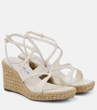The Ayla espadrille wedges from Jimmy Choo add a touch of boldness to your day-to-night ensembles. Crafted from leather with 85mm raffia heels, this pair is characterized by curved straps that create a flattering silhouette. Product Details - Upper: leather - Lining: leather - Sole: leather insole and sole - Toe shape: square open toe - Made in Spain - Includes: shoe box, dust bag - Designer color name: Latte - Item color: white - Contains non-textile parts of animal origin - Item number: P01071250 Size & Fit - True to size - European sizes - 3,5cm-1.5" platform (size EU 38) - 8,5cm-3.5" wedge heel (size EU 38)