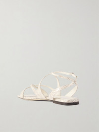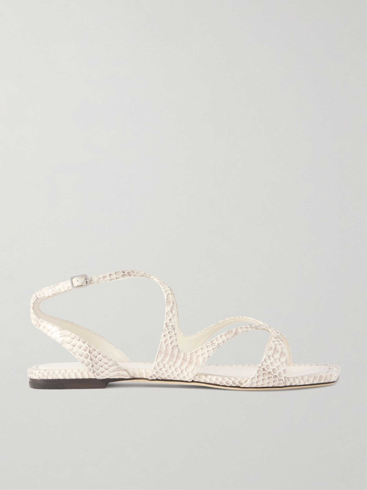 The straps on Jimmy Choo's 'Ayla' sandals frame your foot prettily. They've been made in Italy from snake-effect leather and have square toes and softly padded soles for comfort. Size & Fit - Fits true to size, take your normal size - Only available in full sizes, go up to the nearest whole size if you take a half size - Italian sizing Details & Care - Slight heel - Snake-effect leather (Goat) - Buckle-fastening ankle strap - Designer color: Roccis