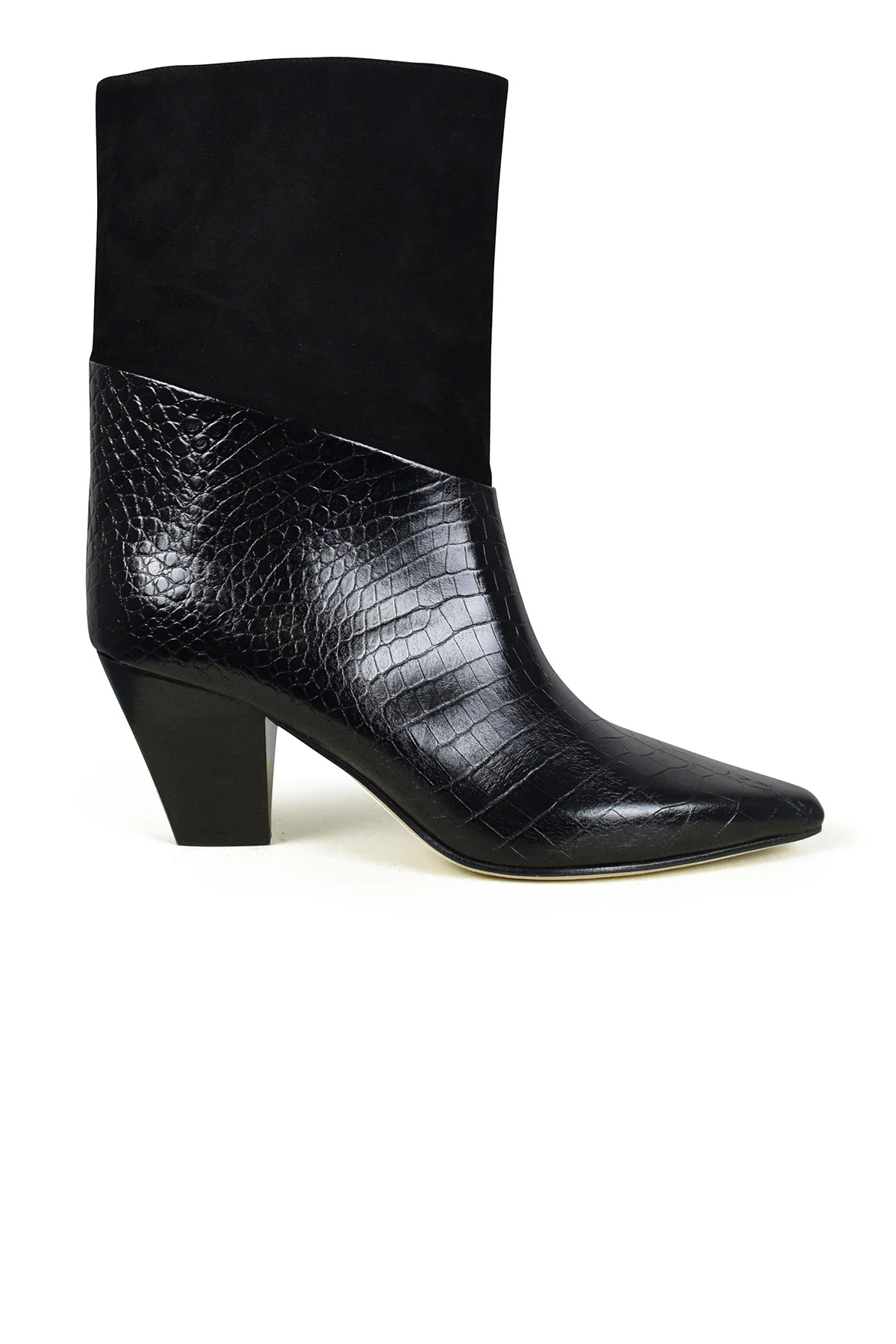 Jimmy Choo Bear model. Details in crocodile-embossed leather and asymmetric black suede. Pointed toe and cuban heel. Heel height 6.5 cm. Made in Italy.