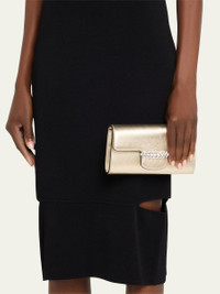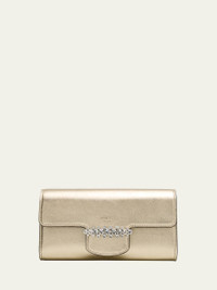 Jimmy Choo "Bing" wallet in metallic napa leather Flap top with magnetic closure; crystal piece Interior, one zip pocket Approx. 5.9"H x 5.5"W x 3.7"D Item Weight (Lbs.): 0.5 Made in Italy