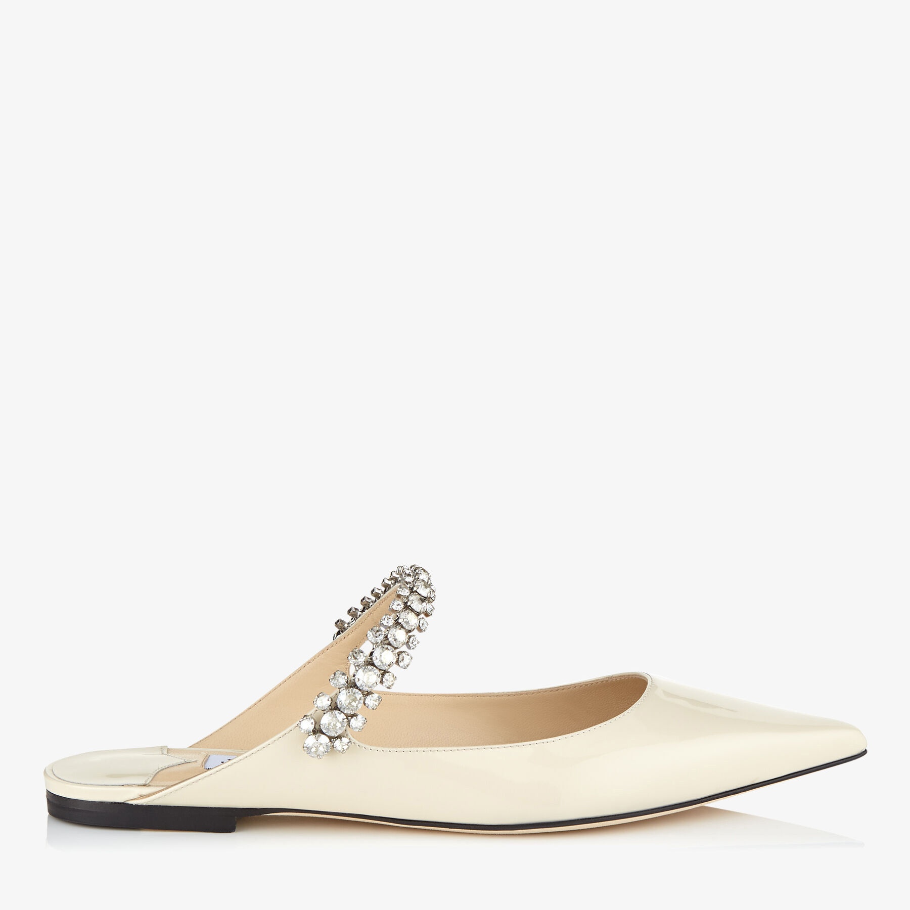Details, Care & Fit Item No. BINGFLATPAT Bing Flat in linen patent leather is modern and stylish. Its beautiful slip on design makes it a unique style while being comfortable and versatile. Featuring a crystal detailing strap across the top of the foot for a hint of glamour and making it the perfect fit to transform an outfit from day to night. - Patent leather - Crystal Strap - Pointed toe - Slip on - Leather lined - Leather sole - Made in Italy