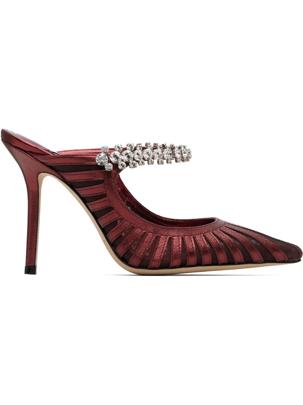 Grained nappa lambskin and mesh heels. · Pointed toe · Crystal-cut accents at fixed strap · Logo patch at grained leather footbed · Covered stiletto heel · Calfskin nubuck sole · Heel: H4" Supplier color: Deep merlot Upper: lambskin, textile. Sole: calfskin. Made in Italy 252528F122021