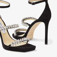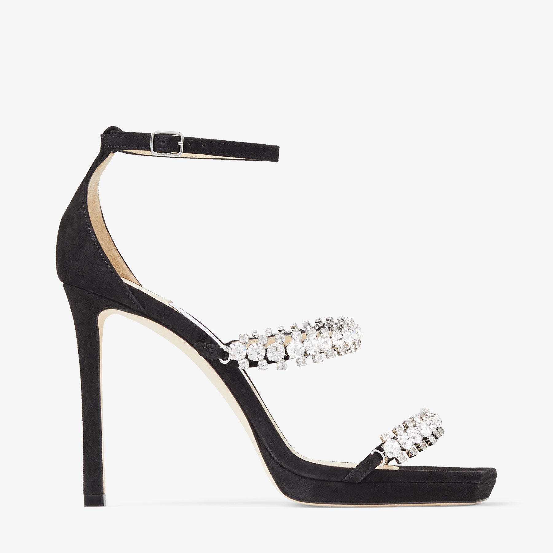 Details, Care & Fit Item No. BINGSANDAL105SIW BING in black suede is effortlessly glamorous. Its beautiful square-toe design makes it a classic style and emphasises the strong silhouette from the 105mm heel. Crystal-embellished straps ensures a sparkling finish. - Suede - Crystal straps - Square toe - Ankle strap - Stiletto heel - Leather lined - Leather sole - Heel height measures: 105mm/4.1 inches - Made in Italy - By purchasing this product, you are supporting sustainable leather manufacturing through the Leather Working Group