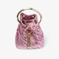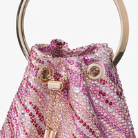 Details, Care & Fit Inspired by contrasts - hard yet soft, sweet yet bold - the aptly named Bon Bon in crystal-embellished satin is an irresistible, statement handbag . It earns its iconic status with a contemporary bucket silhouette that is crowned with a bracelet handle. This versatile design is complemented by a chain shoulder strap, meaning it can be worn as a crossbody or held in hand. - Satin - Degrade hotfix crystals - Bracelet handle - Metal tassel closure with Jimmy Choo engraving - Chain shoulder strap - Bag measures: L 14 x H 15 x W 9.5 cm - Strap drop measures: 55 cm - Handle drop measures: 9 cm - Made in Italy