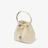 Details, Care & Fit Our signature BON BON bag is crafted from champagne woven sparkle lurex. A statement accessory, it is finished with a metal top handle and a sleek drawstring chain that cinches the supple shape. Slip it over your wrist or carry in hand and cue compliments. - Woven sparkle lurex threads - Metal top handle - Chain drawstring closure - Chain strap - Interior pocket - Tassel detailing - Bag measures: L14 x H15 x W9.5cm - Strap measures: 55cm - Handle drop measures: 9cm - Made in Italy
