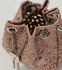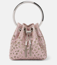 Glamorous events call for charming designs such as Jimmy Choo's Bon Bon Micro bucket bag. Made in Italy from perforated satin, this style is embellished with shimmering crystals and features a sleek circular handle. Product Details - Material: fabric - Lining: fabric - Made in Italy - Designer color name: Light Pink/Light Gold - Hardware color: silver - Closure: drawstring top - Color of chain strap: silver - Includes: dust bag - Item number: P00989882 Size & Fit - Height 12cm-4.5" - Width 12cm-4.5" - Depth 7cm-3" - Chain length 112cm-44" - Length of handle 24cm-9.5"