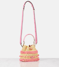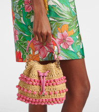Aptly named, the Bon Bon bucket bag from Jimmy Choo is the definition of arm candy. Made in Italy, the woven design has contrast beading and the iconic loop handle. Product Details - Material: fabric - Lining: fabric - Made in Italy - Designer color name: Natural/Fuchsia - Item color: beige, pink - Trim: leather - Top handle, Detachable shoulder strap - Closure: drawstring top - Hardware color: gold - Item number: P01026076 Size & Fit - Height 17cm-6.5" - Max. width 19cm-7.5" - Depth 9cm-3.5" - Length of handle 32cm-12.5" - Adjustable shoulder strap - Min. length shoulder strap 69cm-27" - Max. length shoulder strap 118cm-46.5"