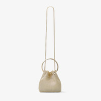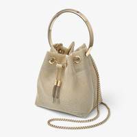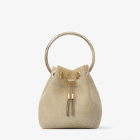 Details, Care & Fit Inspired by contrasts - hard yet soft, sweet yet bold - the aptly named Bon Bon in metallic mesh is an irresistible, statement handbag. It earns its iconic status with a contemporary bucket silhouette that is crowned with a metal bracelet handle. This versatile design is complemented by a chain shoulder strap, meaning it can be worn as a crossbody or held in hand. - Metallic mesh - Metal bracelet handle - Metal tassel closure with Jimmy Choo engraving - Chain shoulder strap - Bag measures: L 14 x H 15 x W 9.5 cm - Strap drop measures: 55 cm - Handle drop measures: 9 cm - Made in Italy