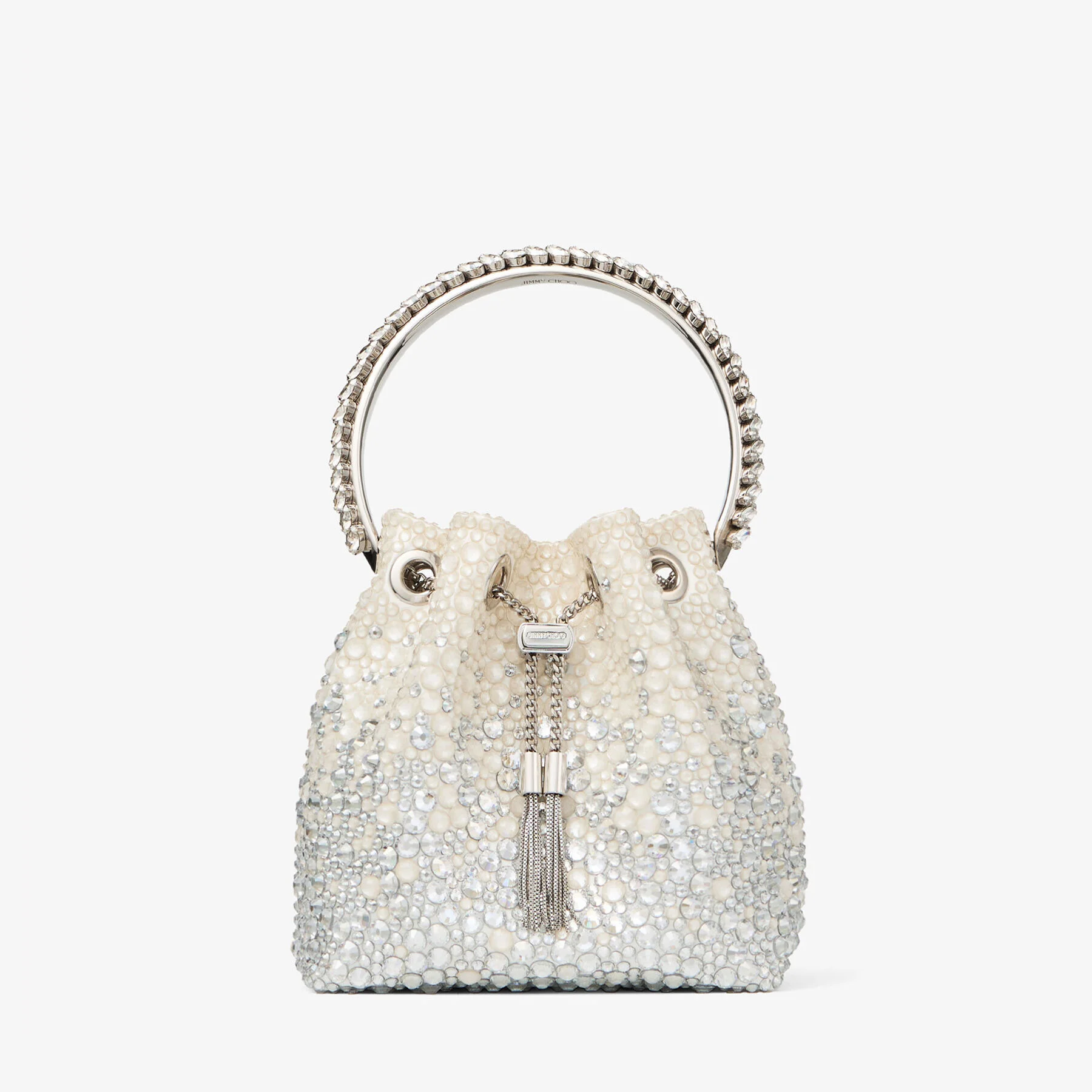 Details, Care & Fit Inspired by contrasts - hard yet soft, sweet yet bold - the aptly named Bon Bon in crystal-embellished satin is an irresistible, statement handbag. It earns its iconic status with a contemporary bucket silhouette that is crowned with a crystal bracelet handle. This versatile design is complemented by a chain shoulder strap, meaning it can be worn as a crossbody or held in hand. - Satin - Hotfix crystal embellishment - Hand-finished crystal bracelet handle - Metal tassel closure with Jimmy Choo engraving - Chain shoulder strap - Bag measures: L 14 x H 15 x W 9.5 cm - Strap drop measures: 55 cm - Handle drop measures: 9 cm - Made in Italy