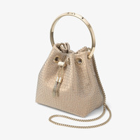 Details, Care & Fit Inspired by contrasts - hard yet soft, sweet yet bold - the aptly named Bon Bon in illusion crystal mesh and satin is an irresistible, statement handbag. It earns its iconic status with a contemporary bucket silhouette that is crowned with a metal bracelet handle. This versatile design is complemented by a chain shoulder strap, meaning it can be worn as a crossbody or held in hand. - Satin - Illusion crystal mesh - Bracelet handle - Metal tassel closure with Jimmy Choo engraving - Chain shoulder strap - Bag measures: L 14 x H 15 x W 9.5 cm - Strap drop measures: 55 cm - Handle drop measures: 9 cm - Made in Italy