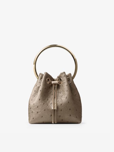 Details, Care & Fit Inspired by contrasts - hard yet soft, sweet yet bold - the aptly named Bon Bon in ostrich leather is an irresistible, statement handbag. It earns its iconic status with a contemporary bucket silhouette that is crowned with a bracelet handle. This versatile design is complemented by a chain shoulder strap, meaning it can be worn as a crossbody or held in hand. - Ostrich leather - Metal bracelet handle - Metal tassel closure with Jimmy Choo engraving - Chain shoulder strap - Bag measures: L 14 x H 15 x W 9.5 cm - Strap drop measures: 55 cm - Handle drop measures: 9 cm - Made in Italy