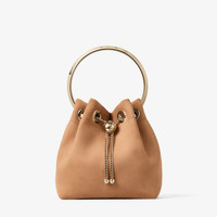 Details, Care & Fit Inspired by contrasts - hard yet soft, sweet yet bold - the aptly named Bon Bon in suede is an irresistible, statement handbag. It earns its iconic status with a contemporary bucket silhouette that is crowned with a bracelet handle. This versatile design is complemented by a chain shoulder strap, meaning it can be worn as a crossbody or held in hand. - Suede - Metal bracelet handle - Pearl closure with Jimmy Choo engraving - Chain shoulder strap - Bag measures: L 14 x H 15 x W 9.5 cm - Strap drop measures: 55 cm - Handle drop measures: 9 cm - Made in Italy